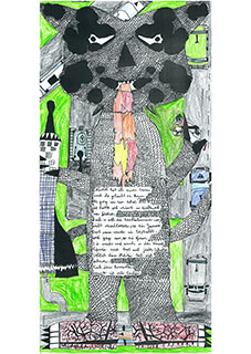 Alexander Lukas beschreibt in seinem Bild die Abfolge seines Traums. In seiner Fantasie taucht eine Echse auf. Erst klein, doch dann verirrt sie sich in ein Kraftwerk und wird durch die Bestrahlung groß und größer. Sie verlässt den Reaktor, tritt in die Welt ein, inzwischen riesengroß, und trampelt auf alles, das sich bewegt. Das Ganze hat er in einer feinen Federzeichnung mit vielen Strukturen gestaltet und nur kleine farbige Akzente beleben das Bild. Das hat uns überzeugt.