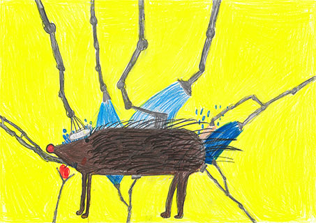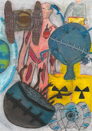 Das Bild von Sarah Elisabeth besticht zunächst durch seine besondere Perspektive, die einen auf den ersten Blick denken lässt, es würde sich um die eigenen Hände handeln, da auch die Größenverhältnisse naturgemäß abgebildet sind. Das zieht einen sofort in die Situation und man kann sich gut vorstellen, den dargestellten ‚Erinnerungshandschuh' selbst zu tragen. Zu sehen sind die Hände einer vermutlich älteren Person, die ein Foto aus Kindertagen zu betrachten scheint und sich durch den ‚Erinnerungshandschuh’ in die Zeit zurückversetzt fühlt. Die Erfindung an sich ist eine verlockende Vorstellung: ähnlich einer VR-Brille, aber noch einen Schritt weitergedacht, da mit dem Tastsinn gearbeitet wird. Das Bild sticht durch die angewandte Mischtechnik aus gemalten und airbrushartig gesprühten Elementen und die dadurch entstehende wunderbare Leuchtkraft hervor. Diese steht wiederum in Kontrast zum restlichen, etwas unscharf dargestellten Bild, das vermutlich die Sichtweise der älteren Person darstellen soll.